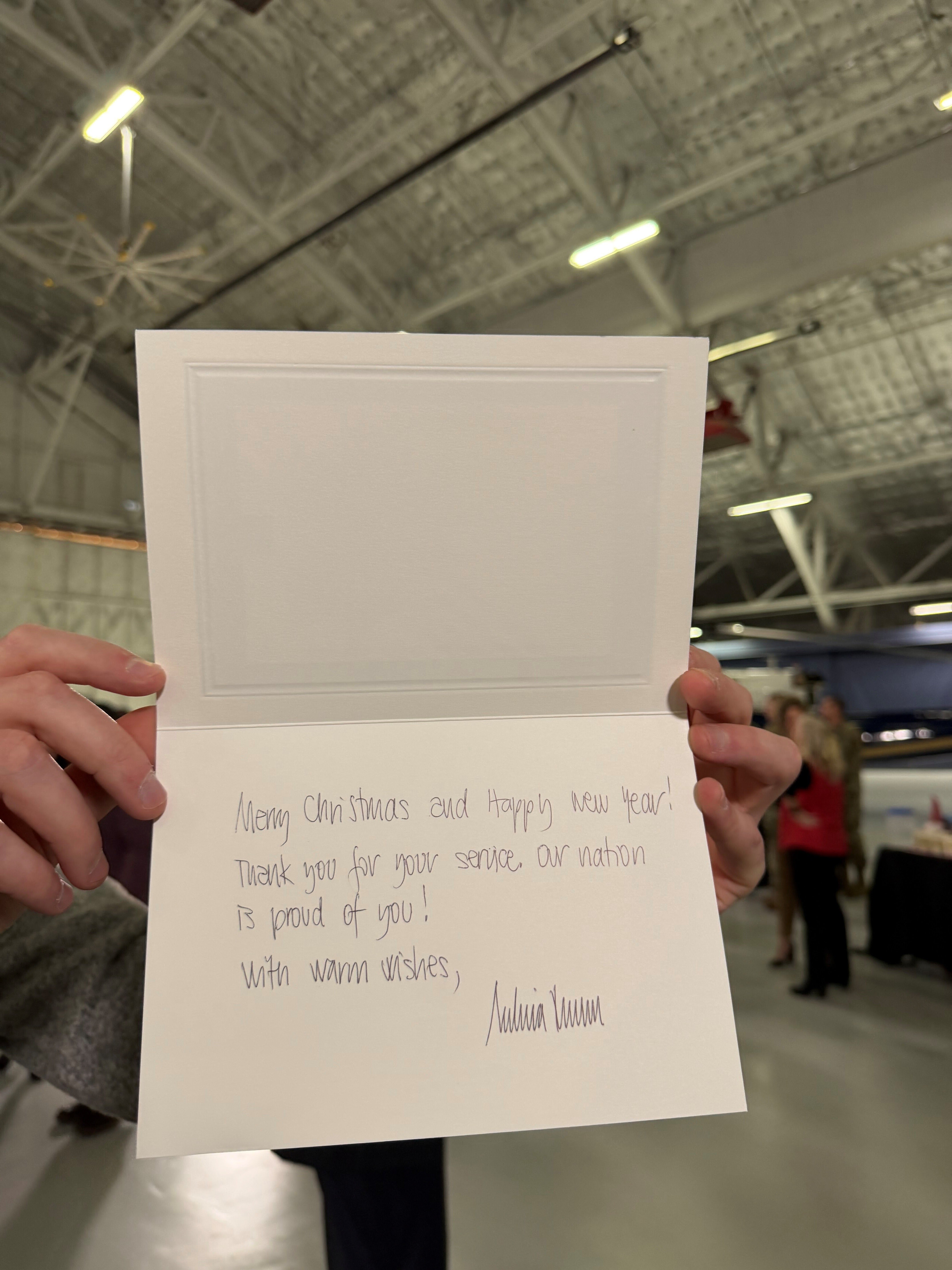 FLOTUS/SLOTUS Pool Report #3 The First Lady and the Second Lady are now participating in Red Cross holiday care package building and card writing with military families. I’m told one guest asked FLOTUS how her Thanksgiving was, and she shared that she spent the holiday at Mar-A-Lago with the president. Both FLOTUS and SLOTUS sat down to write holiday cards to deployed service members, chatting with guests and each other as they did so. We’re out of hearing range but both FLOTUS and SLOTUS appeared to share anecdotes and stories and listened closely to those around them. Mrs. Trump wrote on her card: Merry Christmas and Happy New Year! Thank you four your service, our nation is proud of you!