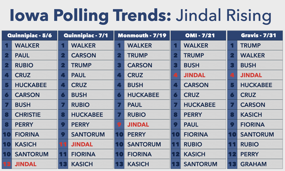 Looking at the most recent Iowa polls, one thing is clear: Iowa voters like what they have been hearing from Governor Jindal.