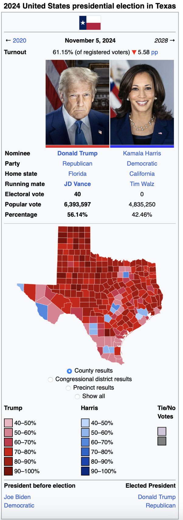 Just spoke to our Great Congressmen and women of Texas. One of them sent me my Results in Texas, and even I didn't know how well I did, but here they are — Won by one and a half million Votes, and almost 14%. Also, won all of the Border Counties along Mexico, something which has never happened before. I keep hearing about Texas "going Blue," but it is just another Democrat LIE. With the right Candidate, Texas isn't "going Blue" anytime soon!